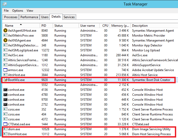 Processes running on PXE Server: BootWiz.exe, dism.exe and DismHost.exeNote: Symantec still doesn´t provide a progress bar to check if Bootdisk Creator (BDC) is still running or finished. With the release of 8.5 there is a new icon which displays the status…(https://epm-blog.com/2019/10/19/did-you-know-series-part-3-whats-new-in-itms-8-5-ru3)