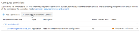 Click on API permissions and add permission from Microsoft Graph. You need to add DeviceManagementServiceConfig.ReadWrite.All