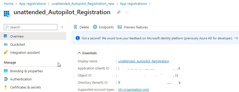 Provide a name (unattended_Autopilot_Registration) for the new App and select “Accounts in this organizational directory only”