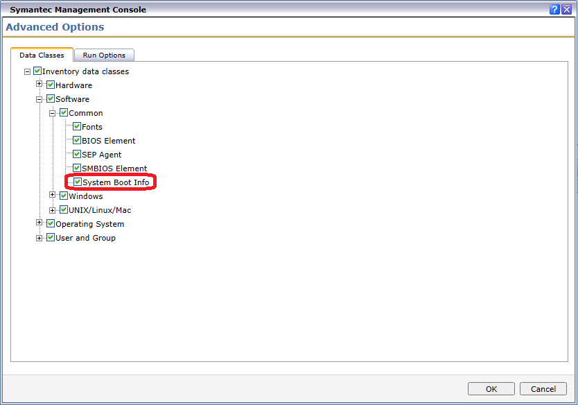 The Inventory Agent can now gather information about your systems boot mode (BIOS or EFI) and its Secure Boot status. To gather this information, include the System Boot Info data class to the scope of the inventory task or policy. The System Boot Info data class is a part of Hardware Inventory, and can be enabled in the Advanced Options of the inventory task or policy under Hardware > Software > Common in the Inventory data classes tree.