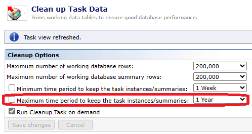 The Maximum time period to keep the task instances/summaries option in the Clean up Task Data lets you specify the maximum time period to keep the task instance summaries in the database. The Maximum time period to keep task instances/summaries option overrides the Maximum number of working database/database summary rows option. For example, if you set Maximum time period to keep task instances/summaries to 3 Months, the clean-up does not remove the task records unless they are older than three months, even if the Maximum number of working database/database summary rows is exceeded.