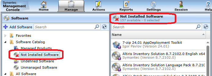 You can now see all software components that are not installed on any managed computers: Open the Symantec Management Console, and then select Manage > Software, and then expand the Software Catalog folder. Select the Not Installed Software view.