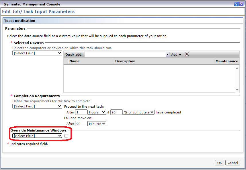 The Automation Policy’s Edit Job/Task Input Parameters dialog has a new option that is named Override Maintenance Windows. This option lets the policy run regardless of the Maintenance Window settings.