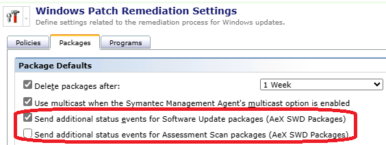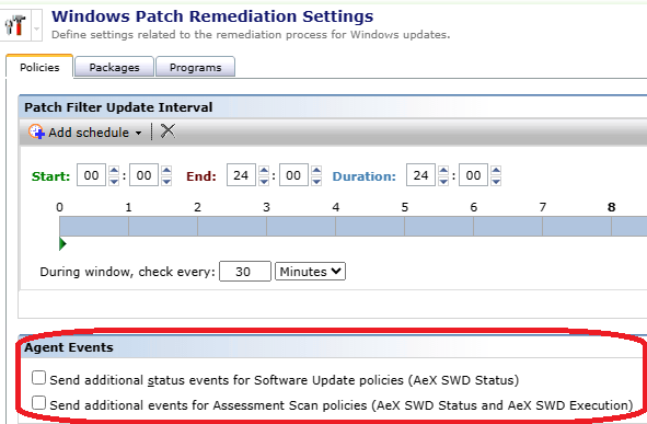 You can decide whether to create and send Notification Server Events (NSEs) related to Windows policy and package patch scans. For more information, see the Options on the Policy and Package Settings tab of the Windows Patch Remediation Settings Page section of the Windows Patch Remediation Settings Page topic.