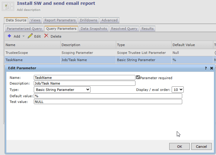 Provide a Name: TaskName and a Description: Job/Task Name. For the Type use Basic String Parameter and a Default value of % and for the Test value: NULL