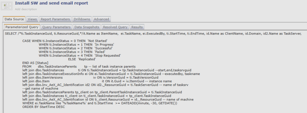 The SQL Report querys all Jobs / Tasks that are started during the last 30 minutes. This value can be changed if needed to a higher or lower value.