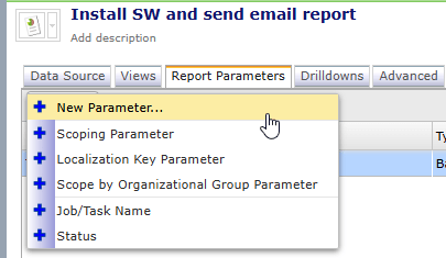 For the Report select the previously generated SQL Report – Install SW and send email report. Click on Edit input parameter and for Job/Task Name select Install SW and send Email