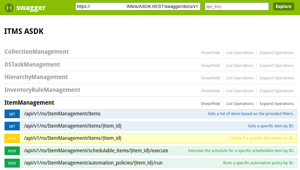 Introduced with ITMS 8.8, the REST API modernizes the Symantec Management Platform, making it more extensible, easier to integrate, and better aligned with cloud, DevOps, and automation frameworks. The ITMS ASDK now supports REST API methods, which are documented on your SMP server at this URL: https://localhost/Altiris/ASDK.REST/swagger/ui/index